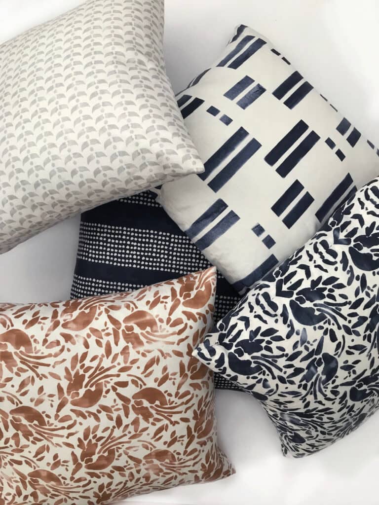 Kelly will also be joined by Ellisha Alexina as a featured textile designer. Ellisha will be doing a pop-up selling pillows cash and carry – great for holiday gifting! Ellisha will be on hand to talk about her unique fabrics and process – she uses a mixed media technique that blends polychromatic screen-printing and hand-painting