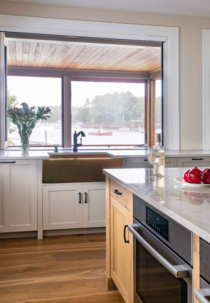 This lovely home in Portsmouth, NH is situated directly on Sagamore creek, a beautiful tidal water way between Portsmouth and Rye. The home owners added a three season porch with a beautiful wood paneled ceiling. In order to create true indoor outdoor flow from the kitchen there is an accordion window from the sink counter to the porch. Once opened, the porch becomes part of the kitchen and the kitchen expands outside.