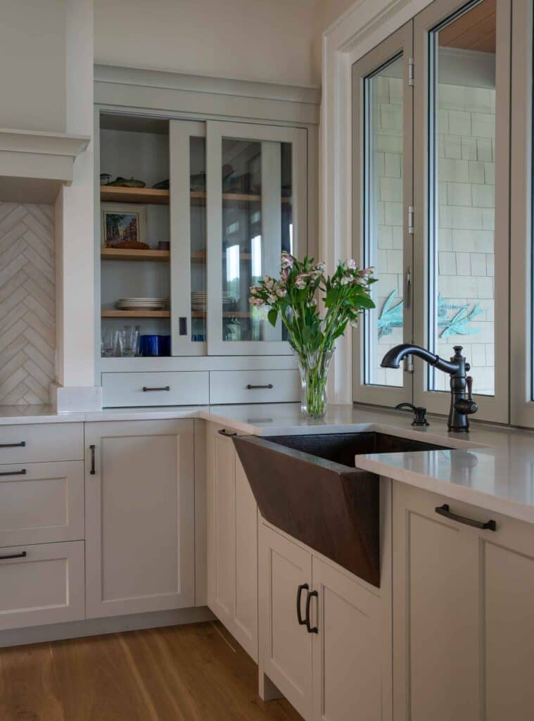 The counter cabinet is a lovely use of an empty corner. With it’s sliding glass doors and reclaimed wood shelves, the counter cabinet is a unique piece of cabinetry that adds depth to the look of the kitchen. This is one of those touches that brings a space from nice to exceptional.