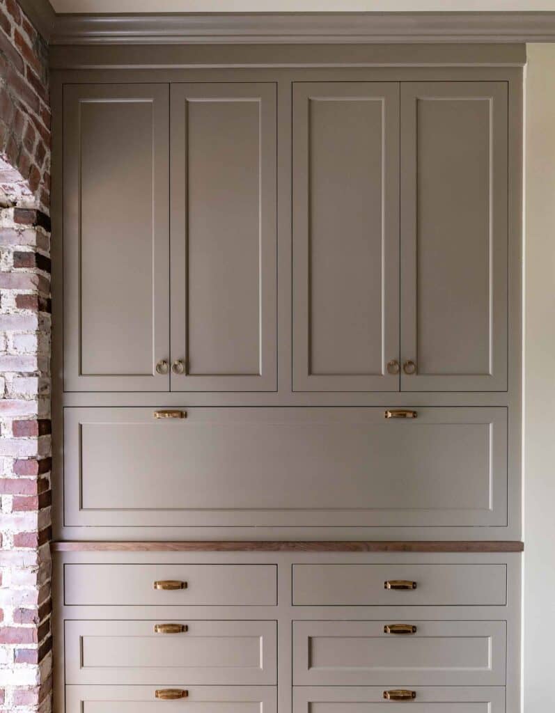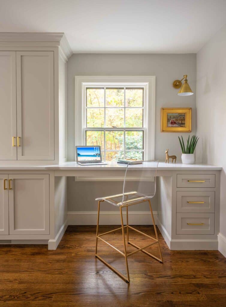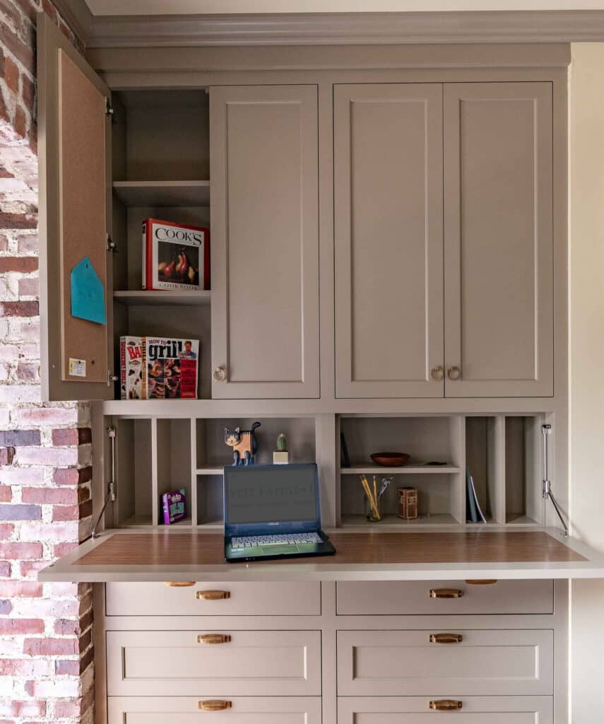 There will always be concessions when working in the kitchen, but there are a couple of design ideas that could make a workable office space within your kitchen. A desk that folds up into a wall unit offers useful space that can be easily tidied away. Placing your desk area at the end of the counter run will help separate your space, even more so if there’s a counter cabinet to create a barrier. Alternatively adding a standing desk area within a large pantry is useful for shorter work tasks.