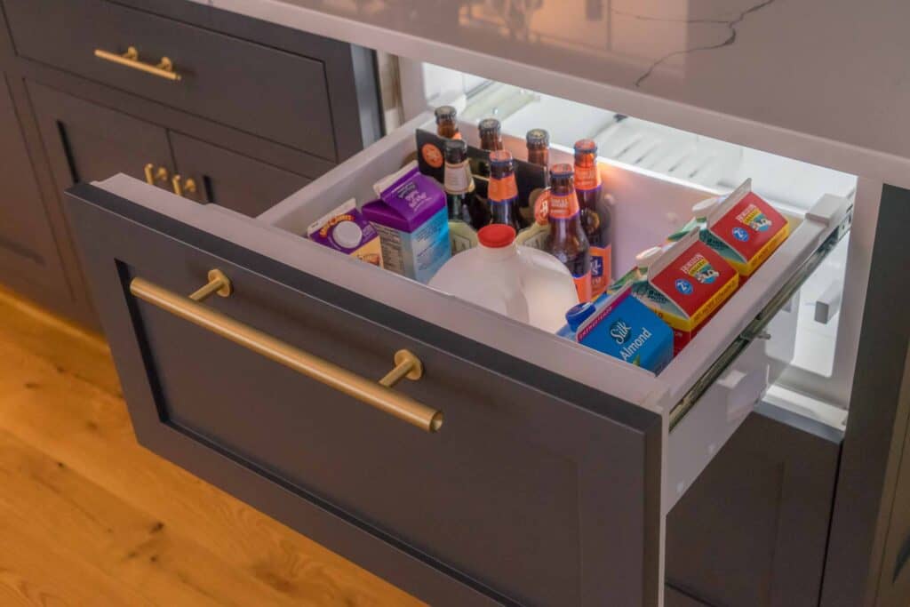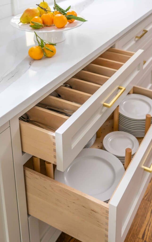Sadly even the most amazing kitchen design will not solve this problem. But we can make dishes less annoying. Dishwasher placement is a key component. Your dishwasher should be near your sink (duh) but it should also be in close proximity to where the clean dishes live. Consider putting silverware and plates and bowls in drawers diagonally opposite your dishwasher, the clean dishes can be put away without taking an extra step. Glasses and mugs could be placed in an upper cabinet or on open shelving above your dishwasher.