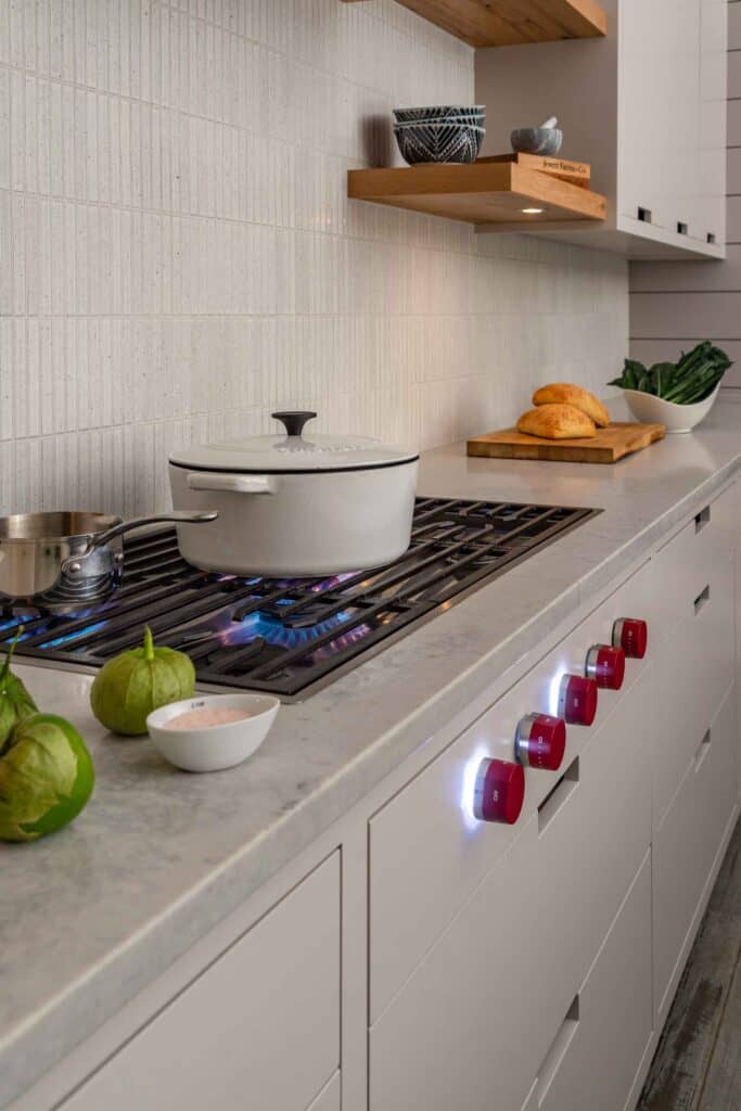 We love this Wolf cooktop. The burners are recessed into the countertop and the beautiful signature red knobs are mounted to a cabinetry panel. This is truly an example of form meeting function. An appliance that is perfectly suited to the design of the kitchen. The judicious use of cabinetry panels on appliances can create a beautiful look that can be very modern or quiet traditional. Learn more about appliance panels here.