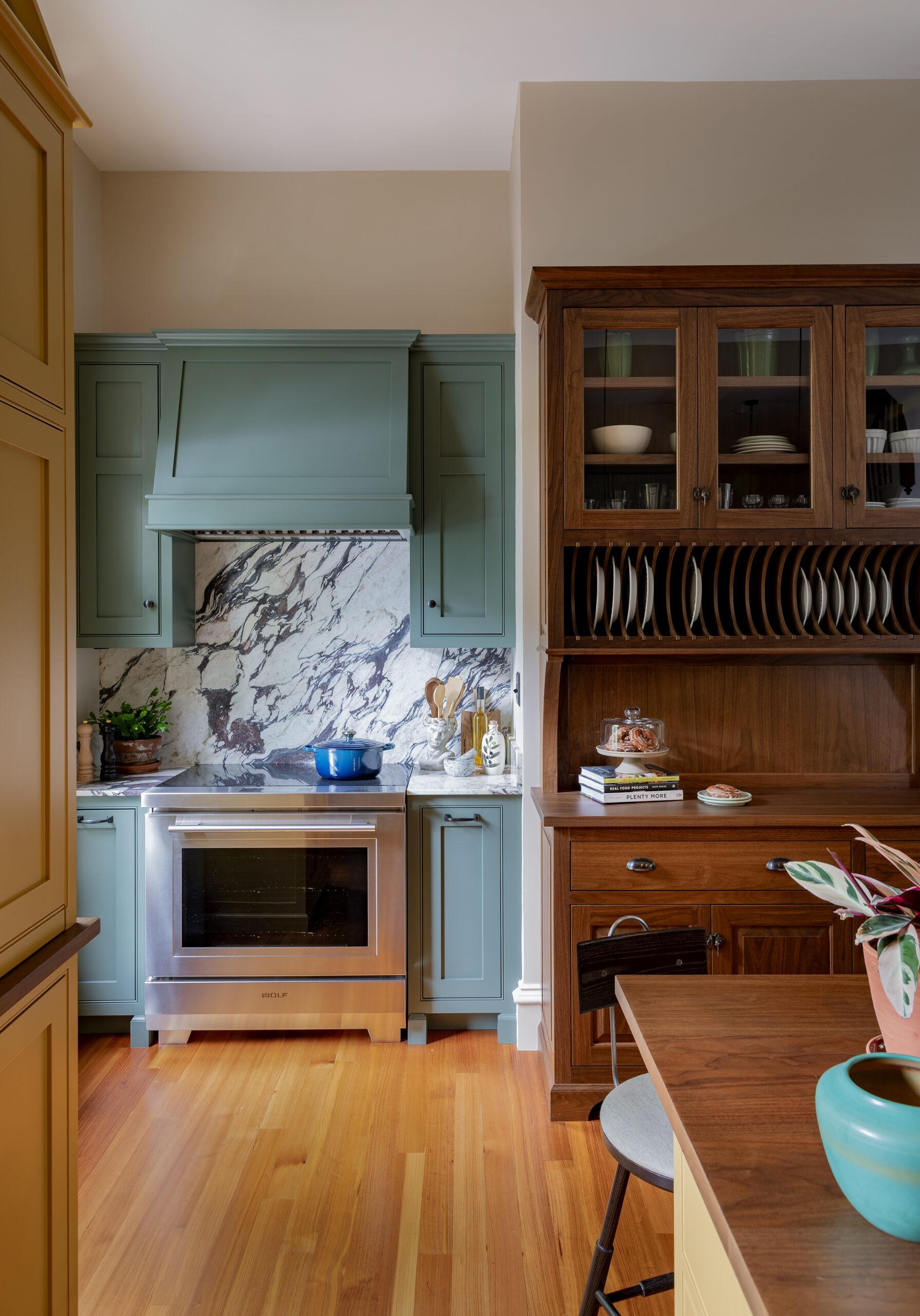 • Cabinetry: Traditional inset single-face frame cabinetry with Walnut interiors and Island. Farrow & Ball Smoke Green, India Yellow. Calacatta Viola Marble.
