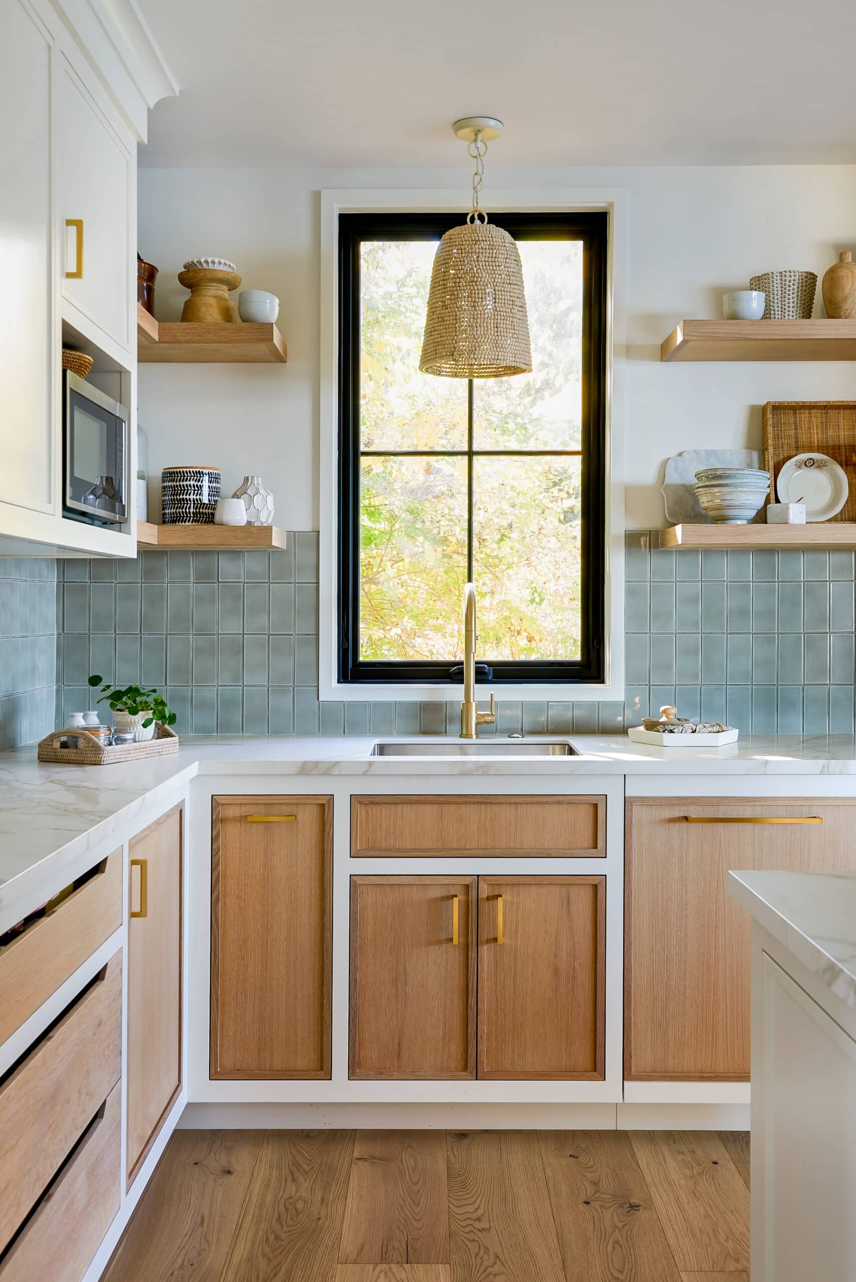 A truly special part of this kitchen design is the walk through pantry. Not only is is packed full of storage, from a pull out pantry, prep sink, double oven, lots of drawers and even a mail slot with hidden outlets for charging devices. Grey green backsplash tile and rift white oak open shelves give this space a ton of style making it a beautiful and useful area.