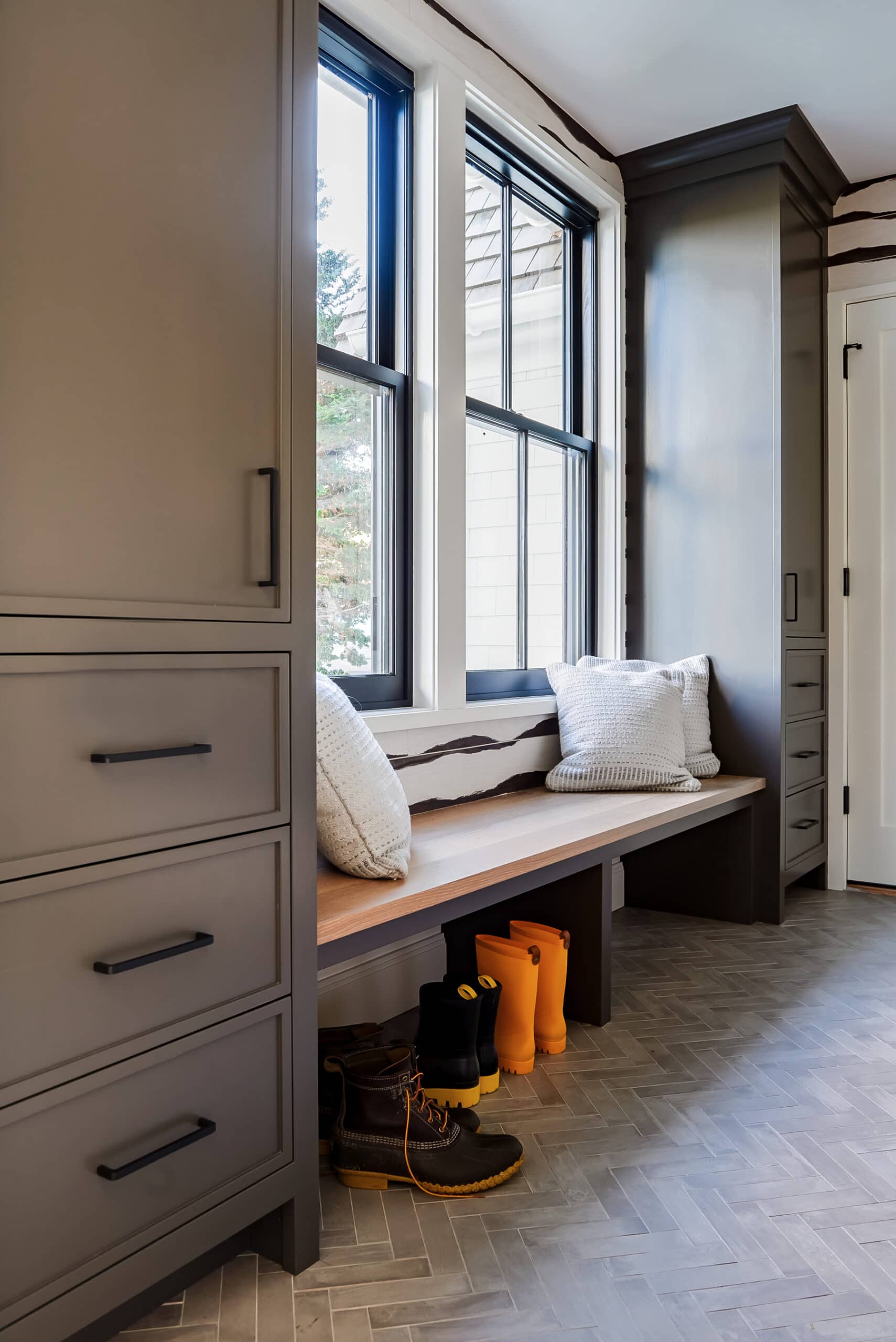 • Mudroom: Traditional inset single face frame cabinetry with micro shaker profile. Painted finish , shelving, and bench seating.